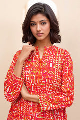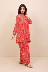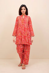 Printed flared frock with side gathers and tassels on neckline, paired with classic fit printed shalwar.