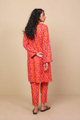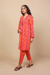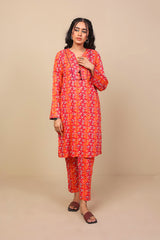 Printed straight shirt, fabric edging on sleeves and front, round neckline with dori tassel and straight sleeves. Paired with printed straight trouser.