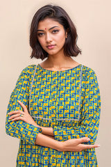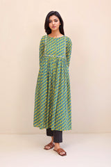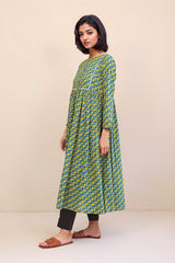 Flared, front open printed dress with button details on placket.