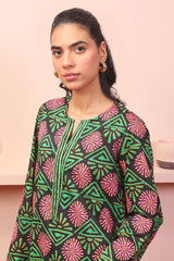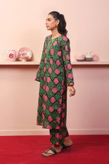 A long loose shirt with round neck with dip, full sleeves and paired with matching printed straight pants.