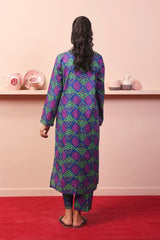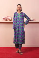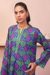 A long loose shirt with round neck with dip, full sleeves and paired with matching printed straight pants.