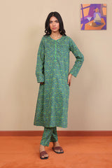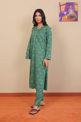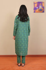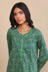 A printed long straight shirt with round neckline and thin placket paired with straight trousers.