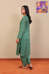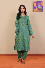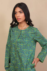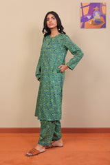 A long shirt with round neck and buttons on thin placket , full sleeves and paired with matching printed shalwar.