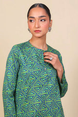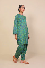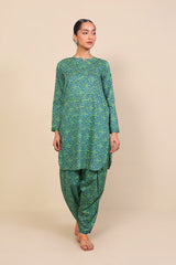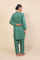 A short tunic with band neckline with buttons on placket, with full sleeves and paired with a matching shalwar.