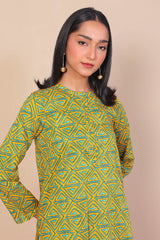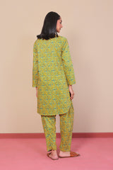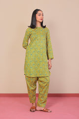 A short tunic with band neckline with buttons on placket, with full sleeves and paired with a matching shalwar.