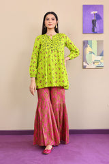 Mutli-printed shirt with pleated middle for flare. Cuffed sleeves and round neckline with buttons.