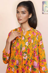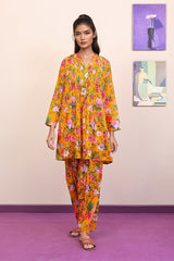 Flared printed shirt with stitched pleat details, paired with straight fit pants.