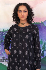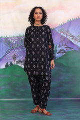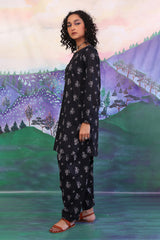A printed shirt, with round neck and buttons on placket, full sleeves, pockets and stitched details on sleeves and neck. Paired with a shalwar.