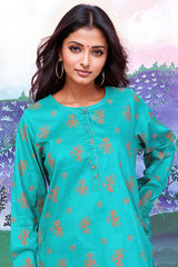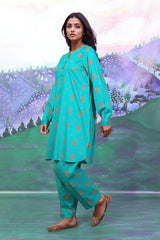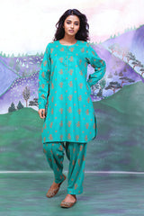 A printed shirt, with round neck and buttons on placket, full sleeves, pockets and stitched details on sleeves and neck. Paired with a shalwar.