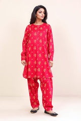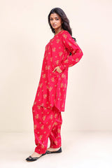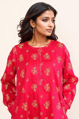 A printed shirt, with round neck and buttons on placket, full sleeves, pockets and stitched details on sleeves and neck. Paired with a shalwar.