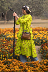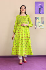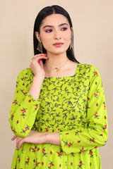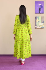 Multi-printed tiered dress with straight sleeves and square neckline.