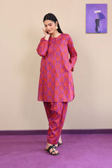 Printed co-ord set with round hem shirt, pockets on side, straight sleeves and round neckline with buttoned placket and a matching shalwar.
