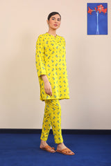 A printed short shirt with full sleeves, band neckline with buttons on placket. Paired with cigarette pants.