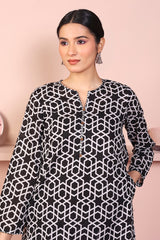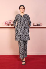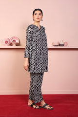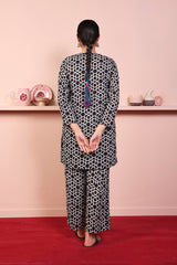 Printed short shirt with pockets on sides, full length sleeves and round neckline V dip highlighted with fabric edging. Paired with printed culottes.