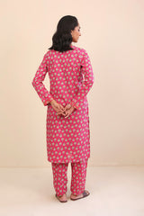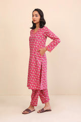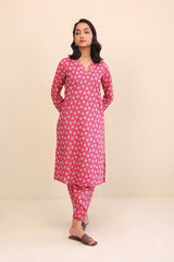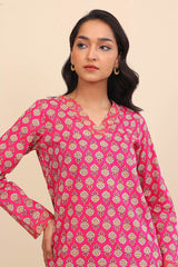A long floral printed kameez with full sleeves, V shaped neckline with stitiched pattern on front. Paired with a matching shalwar.