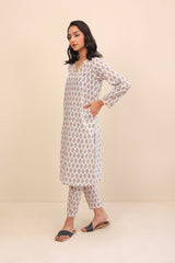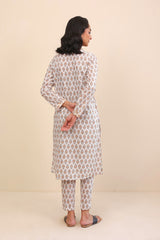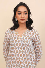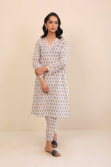 A long floral printed kameez with full sleeves, V shaped neckline with stitiched pattern on front. Paired with a matching shalwar.
