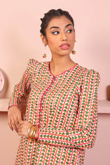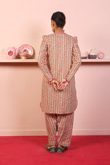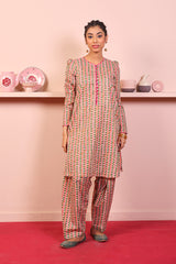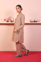 A printed short shirt with fabric button loops on placket with fitted full sleeves. Paired with a matching printed shalwar.