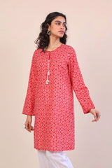 Straight printed kurta with fabric edging on full length sleeves, round neckline with dori tassels.