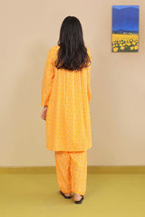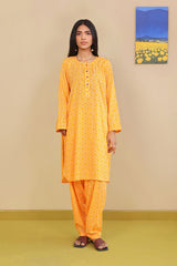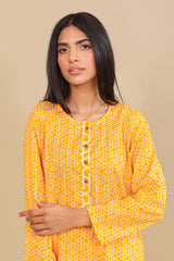 Short printed shirt with round hem, straight sleeves and round neckline with fabric detailed placket. Paired with printed pegged shalwar.