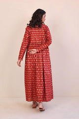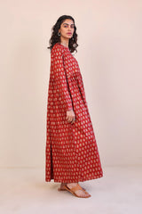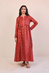 Screen printed long flared dress with gather details on waist.