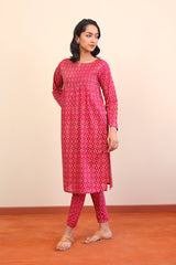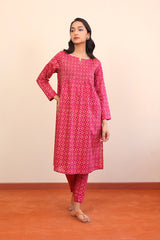 A long printed shirt with a boat neck and dip, pleating details on front with full sleeves. Paired with straight trousers.