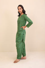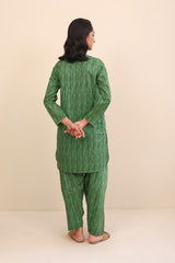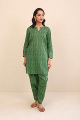 A printed shirt, with crew neck and slit, with embroidered hems of sleeves and pockets. Paired with a shalwar.