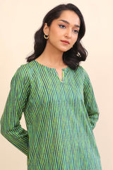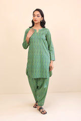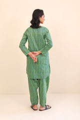A printed shirt, with crew neck and slit, with embroidered hems of sleeves and pockets. Paired with a shalwar.
