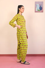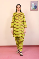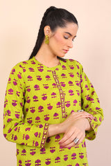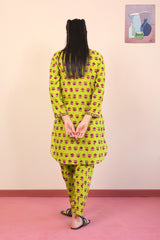 Printed shirt with round hem, pockets on sides, straight sleeves and round neckline with fabric detailing. Paired with printed shalwar.
