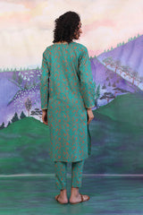A long printed straight shirt with round neck with dip, dori details on neckline and sleeves. Paired with straight trousers.