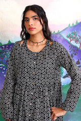 A printed long flary dress with buttons on placket, V shaped cutouts on shoulders and round neckline.