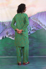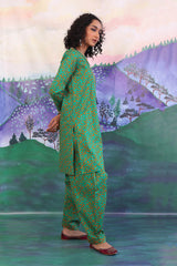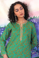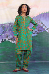 A long printed straight kameez with dori embroidery on neckline, and hems of sleeves. Paired with a matching shalwar.