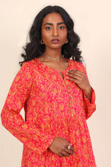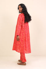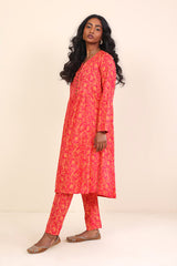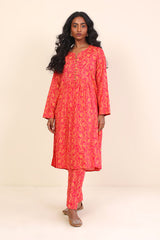 A long flared shirt with print all over, round neck with V cut, and buttons on front with full sleeves. Paired with straight trousers.