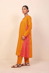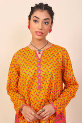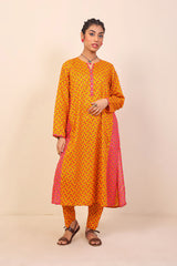 Mutli-printed panelled shirt with fabric edging on sleeves and round neckline. Paired with printed straight trousers.