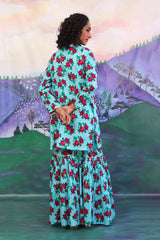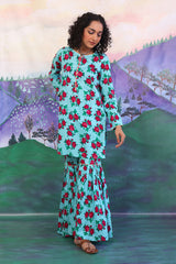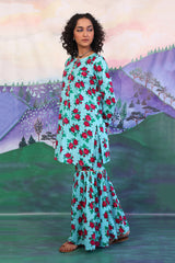 Rose printed short kurti with gota and button details on neckline, paired with flared printed gharara pants.