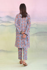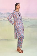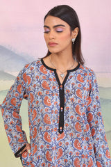 A printed long straight shirt, round neck with open V, solid color piping details with foil embellishment on placket and pockts. Paired with straight trousers