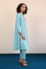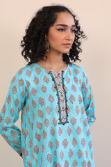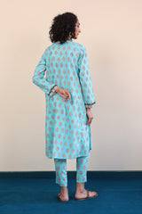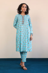 A long panelled shirt with a round neck with V neckline buttons and embroidery on neckline, and full sleeves, paired with cigarette pants.