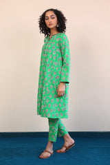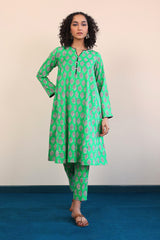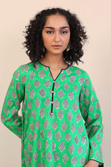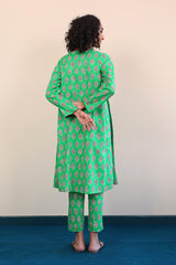 A long panelled shirt with a round neck with V neckline with buttons on placket, and full sleeves, paired with cigarette pants.