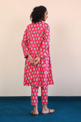 A long panelled shirt with a round neck with V neckline with buttons on placket, and full sleeves, paired with cigarette pants.
