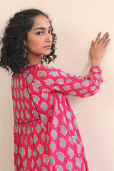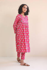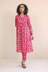 A long shirt with pleats on torso with piping design on front, V shaped neckline and full sleeves. Paired with straight pants.