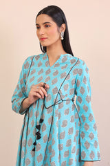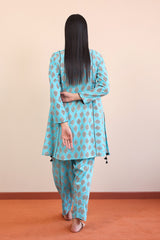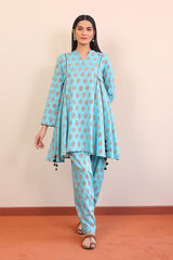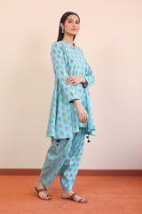 A fun printed peplum kurti with flares on sides and tassels, round neckline with dip and full sleeves. Paired with a matching shalwar.