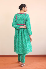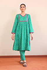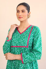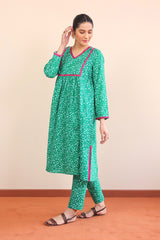 A printed long pleated shirt, with piping details on neck and front. Full sleeves with V shaped neckline. Paired with straight trousers.