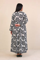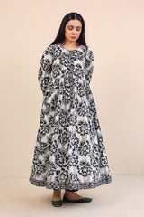 A long printed dress with buttons on placket, full sleeves and voluminous flare.