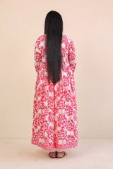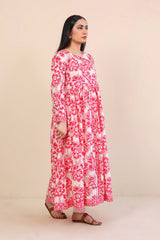 A long printed dress with buttons on placket, full sleeves and voluminous flare.