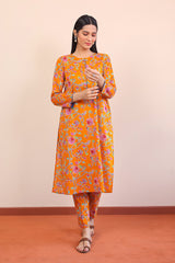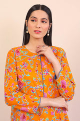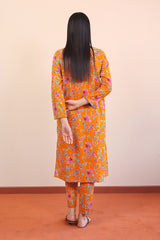 A long printed straight shirt, with round neckline and buttons on placket, with full sleeves. Paired with matching straight trousers.