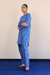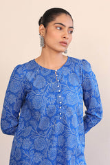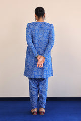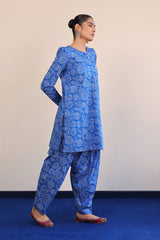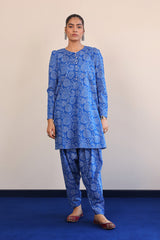 A printed shirt with pleated and puffed sleeves, small buttons on placket and a voluminous printed shalwar.