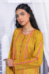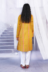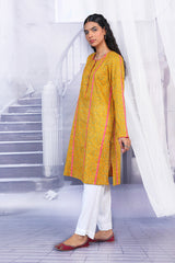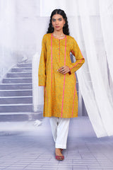 A long straight printed shirt with round neck, buttons on placket and piping details.