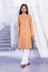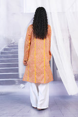 A long straight printed shirt with round neck, buttons on placket and piping details.