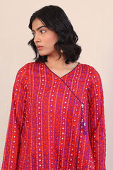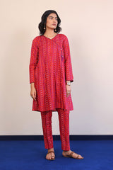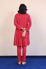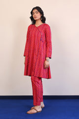Printed, angrakha neckline flared shirt, paired with straight fit printed trousers.