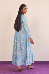 Printed flared dress with buttons and gather details on waistline.