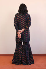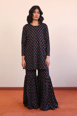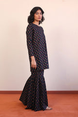 Printed straight fit shirt with round neckline. Paired with flared printed gharara pants.